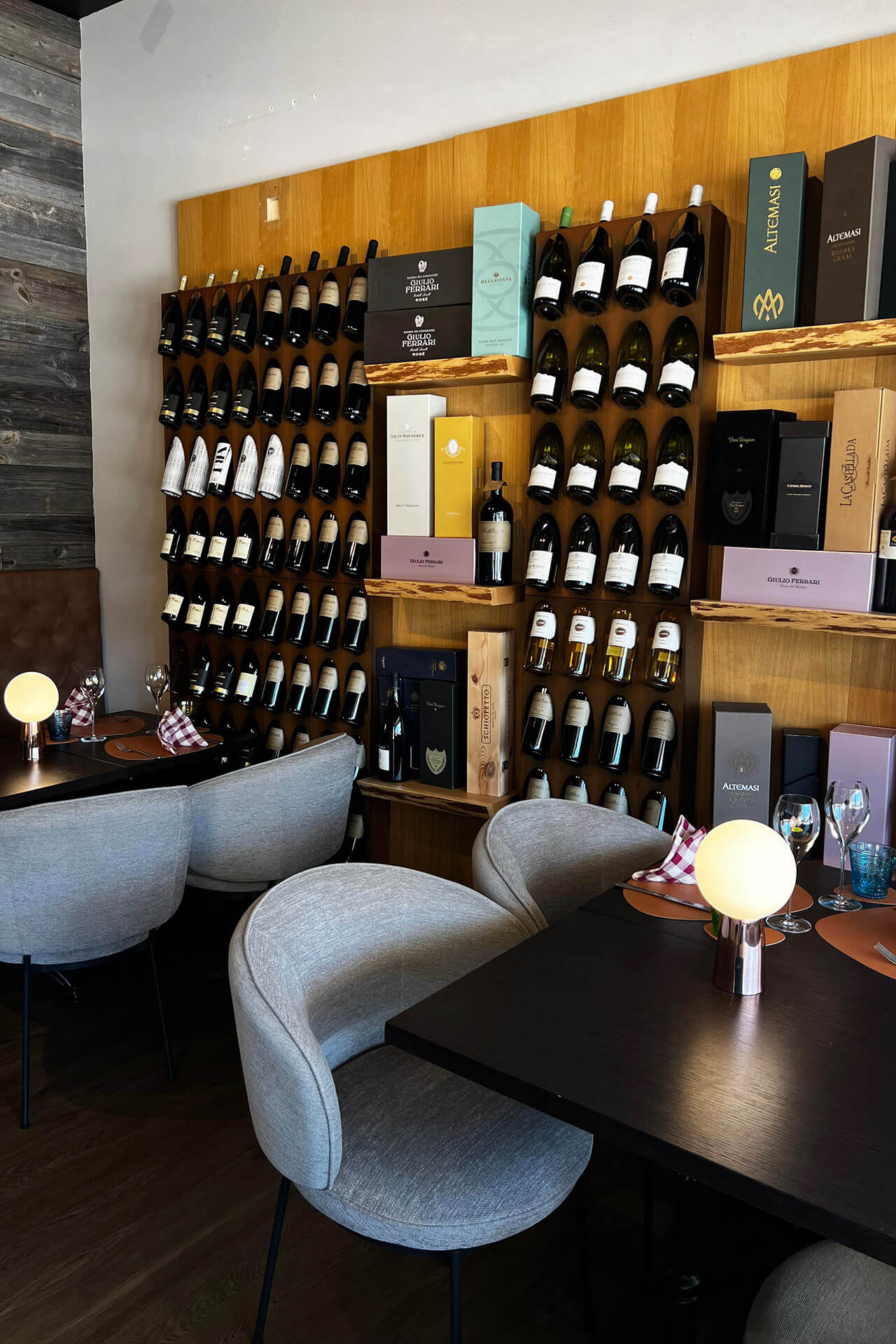 L’enoteca offre una vasta selezione di oltre 400 etichette di vini italiani e internazionali, anche in vendita da asporto; mentre la cicchetteria propone stuzzichini sfiziosi con salami e salumi di selezione, formaggi del territorio piatti della cucina veneto e friulana come baccalà, trippe, frico, polpette, sardine e gamberi in saor…